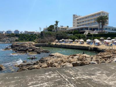 Hotel je na útesu, takže vstup do volného moře je po žebříku. Vedle je přírodní bazén, vytesaný do skály, vstup po schodech. Lehátka jsou volná zrána, chodí kontrola, zda jste z hotelu, chtějí číslo pokoje. Pár lehátek je i na trávě před hotelem. Kolem 11 hodiny vše plné.