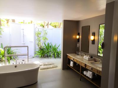 Překrásné plážové vily poskytují vše, co je třeba, včetně venkovní koupelny se sprchou i vanou a dvěma umyvadly. Před vilkou máte zaparkovaná dvě kola, takže se bez problémů dostanete rychle kamkoli po ostrově. Vila je přímo u moře, takže každý má vlastně svůj soukromý kus pláže. Soukromí je na tomto ostrově opravdu prioritou.