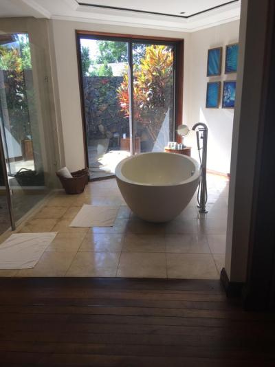 Každá vilka má svůj bazén a vlastní terasu. Pokoje s volně stojící vanou.