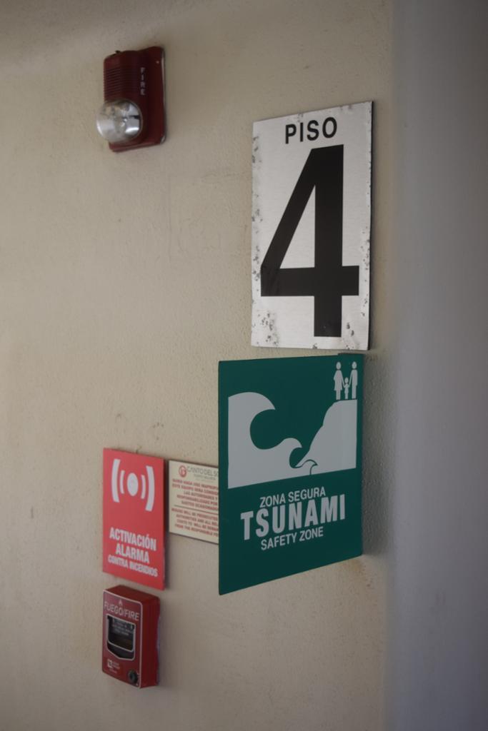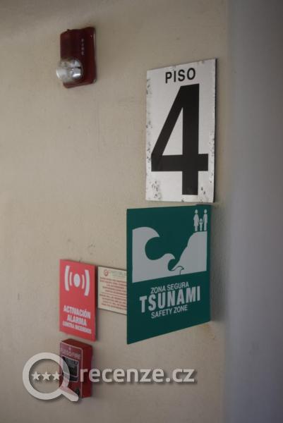 Zajímavé jsou i bezpečnostní piktogramy - kromě obvyklých směrovek úniku v případě požáru jsou pokyny i pro případ hurikánu a je zde i opačný směr, v případě tsunami.