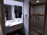 Hodně překvapí řešení sociální části, umyvadlo se zrcadly je situováno v rohu pokoje a oddělen je jen růžek s toaletou a sprchovým koutem (je to prý běžné, aby dílčí úkony mohly provádět 2 osoby současně...), nejstarší výbavou jsou zjevně obklady, ale opravdu vzorně udržovány a denně čištěny. Trochu delší náběh teplé vody, jak v umyvadle, tak sprše (asi jsou oddělené stoupačky), ale teče jak studená, tak i dost teplá a slušným proudem. Snad potřetí v životě k dispozici protiskluzová podložka do sprchy (ač skoro není třeba), jen 1x za celý týden chyběla předložka před sprchu /opravdu to není třetí ručník/, jinak vždy uplně čerstvá spr. osušky, malého ručníku + mini kosmetického, vše sněhobílé, měkounké. Denně doplňovány i hygienické přípravky.