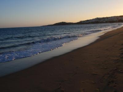 Jak jsem již uvedla, k pláži vedla cesta kolmo dolů po dřevěných schodech, což mi moc nevyhovovalo, cítila jsem se na nich nejistá, hlavně když se tam pohybovalo hodně lidí současně. Na pláži mi chyběla sprcha a také jsem postrádala pobřežní promenádu. Slunečníky a lehátka dost drahé, set stál 10 € a v hlavní sezóně prý navýší cenu na 15 €. Oceán krásný na dívání, velmi chladný na plavání. Možná bude v dalších měsících teplejší, ale takhle chladný jsem nečekala, protože před třemi lety v Maroku (což je jen kousek níž) byl touto dobou hezky teplý. Rozhodně ale stojí za dívání, můžete tam sedět dlouhé minuty a jen se dívat na ty nádherné vlny a krásnou modrou měnící se barvu.