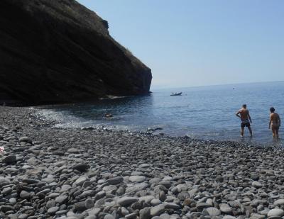 Oceán je v dohledu, ale vede k němu dost dlouhá a prudce dolů klesající serpentina, což nám ovšem nevadilo. Dá se tam jet lanovkou nebo dojít pěšky. Pláž z velkých kulatých oblázků, vlny přiměřené, oceán teploučký. Nad celým komplexem pláže a restaurací se tyčí obrovský vrstevnatý útes, je to velmi krásné.