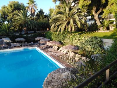 Hotel umístěn v krásné zahradě, ale přístup k moři po patrech po schodech, proto mohou mít lidé s pohybovými problémy trochu stíženou cestu na pláž. Pokoj úžasný, s ledničkou a trezorem, klimatizací, malou vanou, TV, manželská postel spíš užší - dva mají trochu problém. V hotelu jsou jen 2 malé výtahy na 4 patra. Mezipatro bez balkonů, ale s výhledem na moře. Měnili jsme raději za pokoj s výhledem na hory a do zeleně ve 3.patře. Wifi i na pokoji.