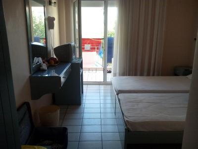 Maličký pokojík s obrovským balkonem. Sprcha a záchod v jedné místnosti, klimatizace samostatně ovládaná, takže za nás naprostá spokojenost. Na pokoji je opravdu jen skříň (spousta ramínek, to odjinud neznáme), zrcadlo a dvě postele, ale bohatě to stačí, stejně se tam člověk jen vyspí. Balkon je v poměru k pokoji obrovský, dvě plastové židle a kulatý stolek.