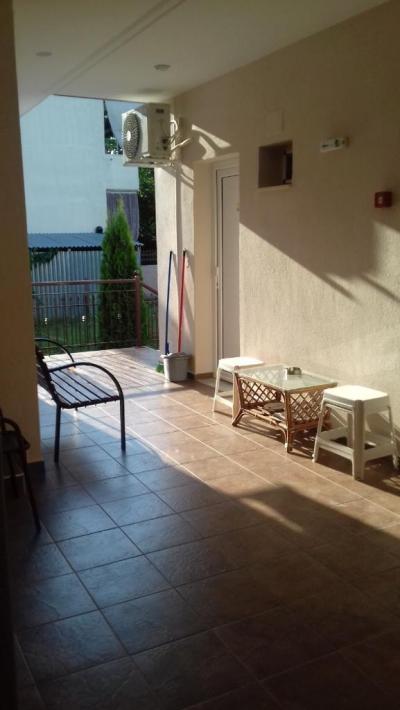 Stoleček a židle jsme si na tuto naší "terasu" museli přenášet z pokoje. Při sezení nás rušilo nejen procházení ostatních ubytovaných hostů, ale dokonce také splachování a čištění záchodů záchodovými štětkami, které se ozývalo z výše uvedených okének. Snídaně, večeře nebo "jen tak strávený čas" na této "terase" byl tedy velmi špatně realizovatelný.