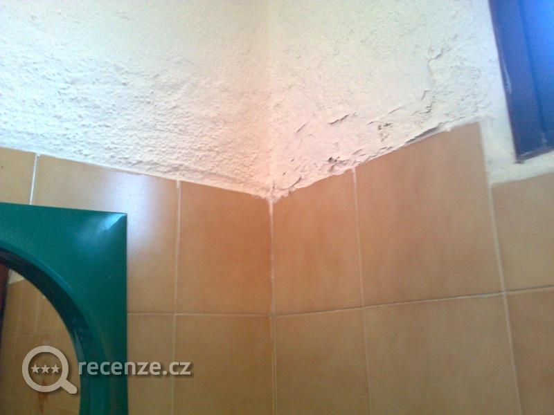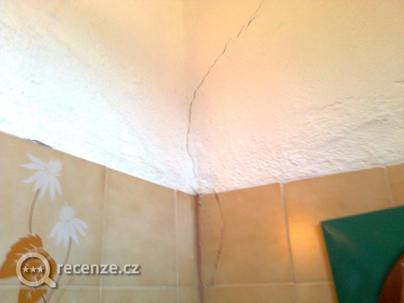 Elektroinstalace - zásuvka visela 1 cm od stěny, vypínač, aby se nerozpadl, slepený izolepou, kryt světla v koupelně, rovněž přilepený izolepou.