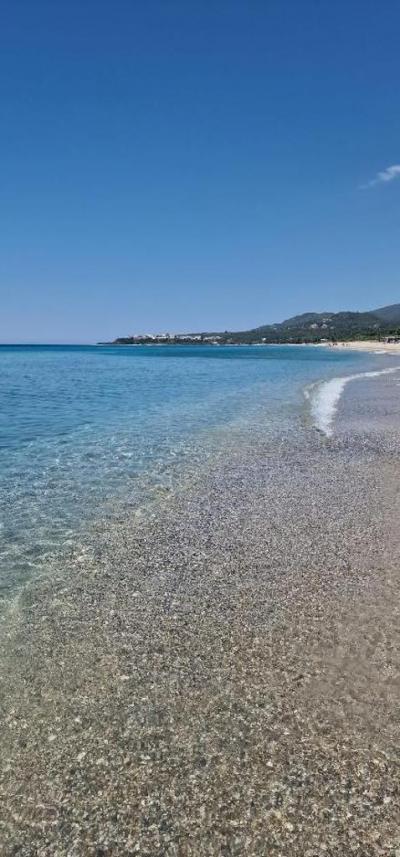 a v moři velké kameny. Bez bot do vody se neobejdete. Stačí jít trochu doprava za slunečníky a situace je diametrálně jiná, pozvolný vstup do moře a písčitá pláž,