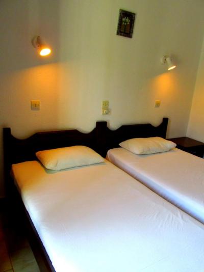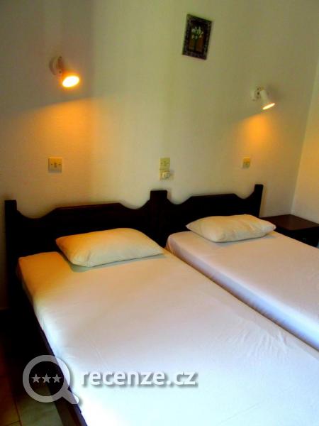 Vila Sakis má dvě hvězdičky, které plně odpovídají vybavení i úrovni služeb. Měli jsme přízemní apartmán s balkónem pro 2 osoby. Vybavení je starší, je zde trochu cítit zatuchlina, ale jinak čisté. Je to jeden malinký pokojíček s kuchyňkou, jednoplotýnkovým vařičem a koupelnou. Balkón je moc hezký, orientovaný do krásné a udržované zahrady. Velice praktický je větrák nad postelí. Doporučuji přibalit s sebou repelentní strojky na komáry, je jich tam mraky a po setmění nepomůže příliš ani to, je lépe nechat okno zavřené.