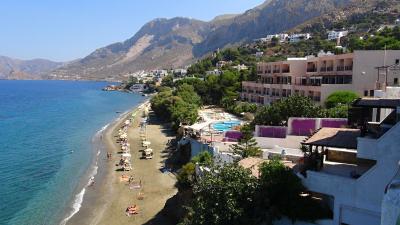 Moře nádherné, průzračné. Pláž malinká, spíše oblázkový vstup do moře. Dojde se k ní asi po 50m. Další pláže jsou kousek od hotelu. Nádherné pláže jsou na ostrově Telendosu, kam Vás převeze malá loď z přístavu v Mirties. Pluje se asi 10 min a cena 2Eu. Loď vyplouvá každých 30 min.