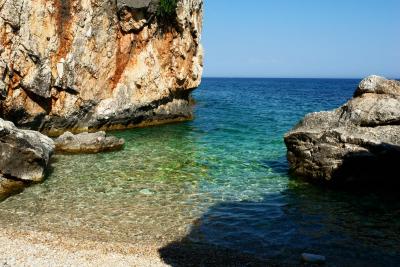 Obě plážičky u hotelu jsou fotogenické a fantastické pro milovníky šnorchlování (bohatý podvodní život, krásné útesy, podvodní jeskyňky, velká hloubka a mimořádná viditelnost). Během cest po ostrově jsme objevili jen minimum v tomto ohledu srovnatelných lokalit. Jsou však poměrně malé, takže při plném obsazení hosty je těžké najít stín a také, jak je obvyklé prakticky v celé Kefalonii, jsou plně oblázkové. Je tedy lépe přibalit koupací obuv. Hotel samotný se nalézá na svahu, k plážím v obou rozích jakéhosi přírodního amfiteátru vede schodiště. Ani hotel, ani jeho pláže rozhodně nejsou ideální pro hůře pohyblivé klienty. Pokud si člověk ve Skale zapůjčí člun, lze v oblasti na sever od hotelu nalézt přenádherné liduprázdné pláže (viz přiložené fotografie).