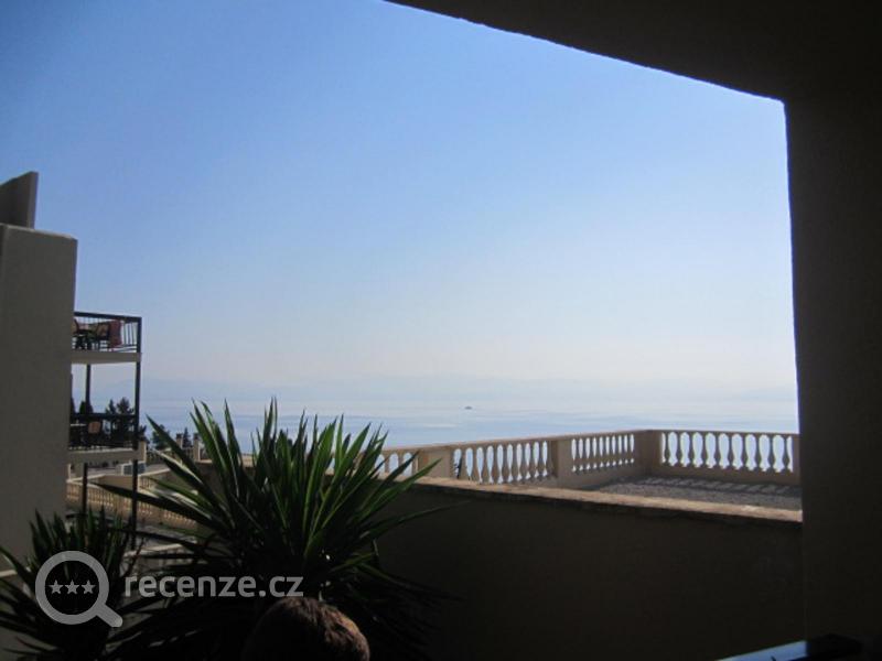 Dostáváme se k onomu rozčarování - příplatkovaný výhled na moře. Po otevření balkonových dveří jsme měli pěkný výhled na protější balkony hotelu. Po vyklonění se ze zábradlí jsme pravým okem nejprve zahlédli roh terasy hotelu a až za ní bylo vidět moře. Po upozornění delegátovi jsme se dozvěděli, že vlastně výhled na moře máme.