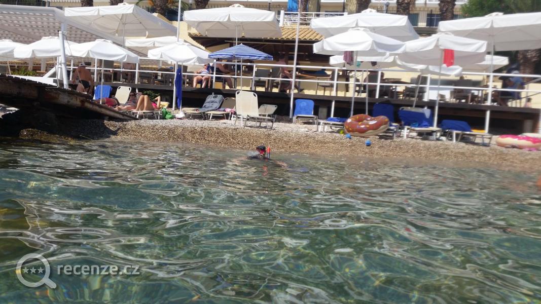 Oblázková .bez ježků. Pozvolný sestup do moře. Slunečniky lehátka. Zdarma