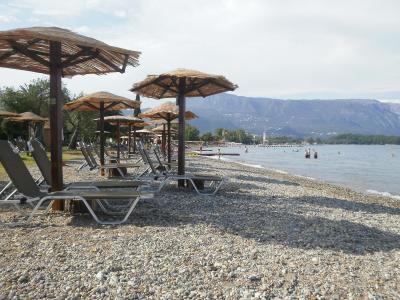 Příjemnou a krátkou procházkou se dojde k moři, kde je oblázková pláž a i zatravněná plocha. Zde pod olivovníkem se dá krásně odpočívat, pokud někdo nechce plážový servis.Cena za slunečník a 2 lehátka je 10Euro na celý den.Využívali jsme obojí dle toho, jak jsme chtěli být na pláži dlouho, neboť ke koupání láká i bazén u hotelu.Voda v moři je bez vln,tudíž se zde dobře plave.