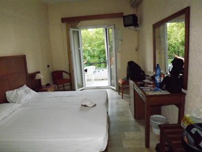 Hotel je na začátku ulice s tavernami a obchůdky, v zahradě. Naproti vchodu opustěná nedokončená stavba, tedy nic malebného.
