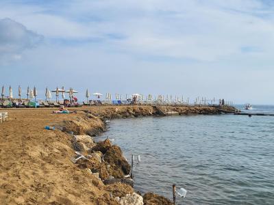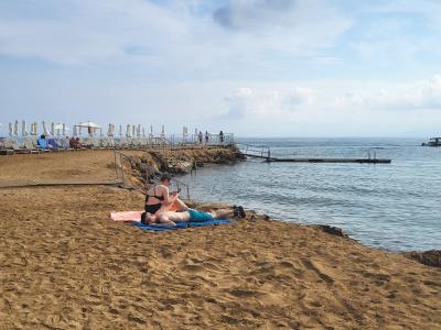 Moře čisté, kousek od břehu písek. Pláž není pro malé děti nebo lidi s pohybovými potížemi. Zpočátku jsme byli nemile překvapeni, ale zvykli jsme si. Přístup do vody po schůdkách nebo asi po 100m u kraje moře oblázky. Pláž je poměrně úzká, ale dá se procházet po okraji moře.