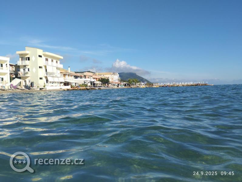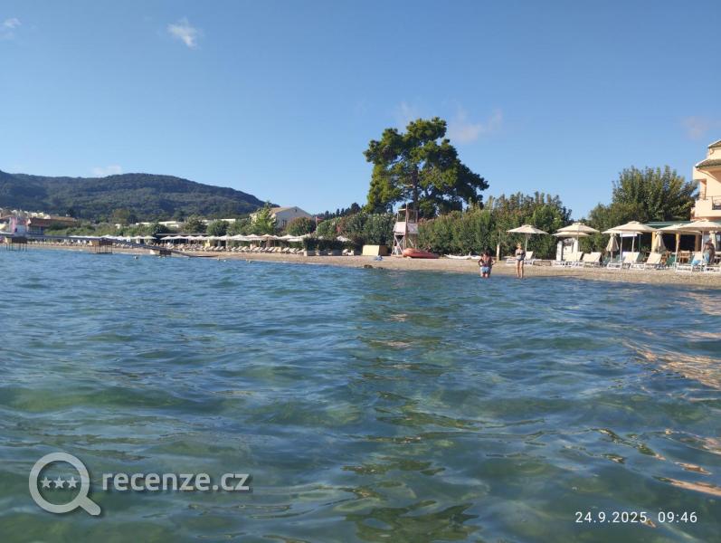 Pláž blízko, od boční brány hotelu (tak 100m) jen přes silnici a úzkou uličkou k penzionu u moře , kde jsme kupovaly lehátka (15euro za set, nám dávali dva sety za 25 euro pro tři osoby), paní z penzionu velmi ochotná, bylo tam i wc, bufet, na pláži sprcha (nebo spíš trubka, dostačující pro běžnou očistu od slané vody).