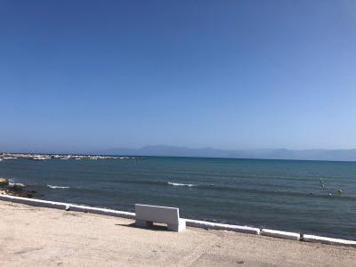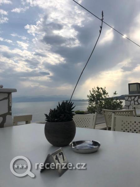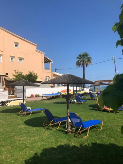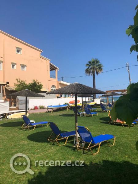 Moře je před hotelem,ale ne na koupání,na pláž musíte asi 300m do Rody nebo si dojít kousek do Acharavi podél moře asi 15min tam je dlouhá pláž s bary u kterých jsou lehátka a slunečníky,stačí si něco dát a za lehátka nic neplatíte,některé jsou moc hezké a výborně vaří
