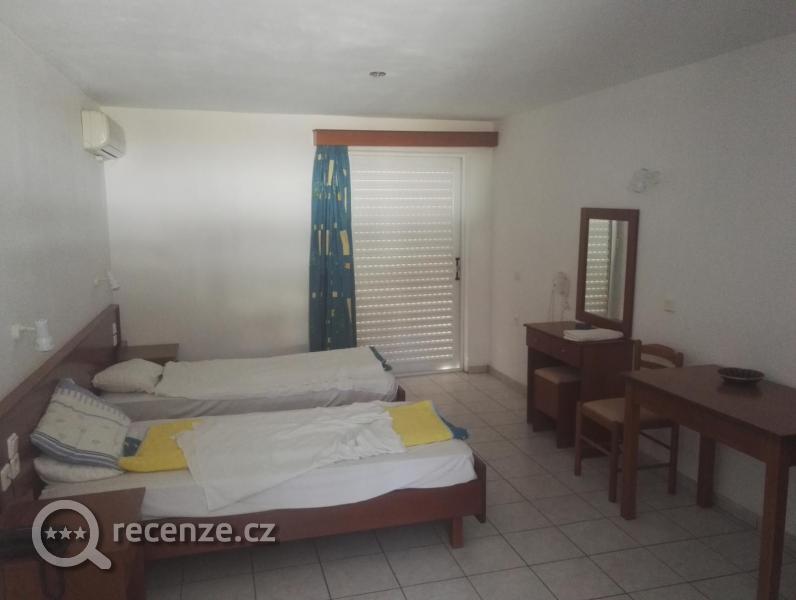 Hotel je v klidné části města,kam nedoléhá ruch z centra města.Na pláže je to asi 800m a do první taverny asi 300m.Pláž je menší,ale uklizená.Nabízí lehátka a slunečníky(set 2*lehátka a slunečník stojí 8 euro na celý den.Pláž je písčitá,pozvolna se svažující do moře.
