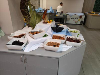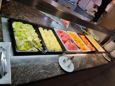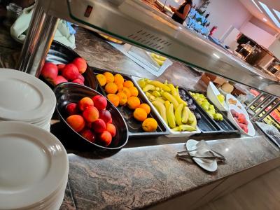 Výběr jídel neuvěřitelný.Kazdy den obrovský výběr jídla ryby,suschi,zelenina ,pizza,ovoce ,,olivy.,přílohy hranolky, Peč brambory,kuskus , rýže .....Milionový výběr. Obměňují sortiment , když jsem si něco chtěla dát co mně chutnalo včera bylo Tam zase něco jiného , vegetariánský pult samozřejmostí . Pití x druhů na samoobsluze včetně piva kávy.