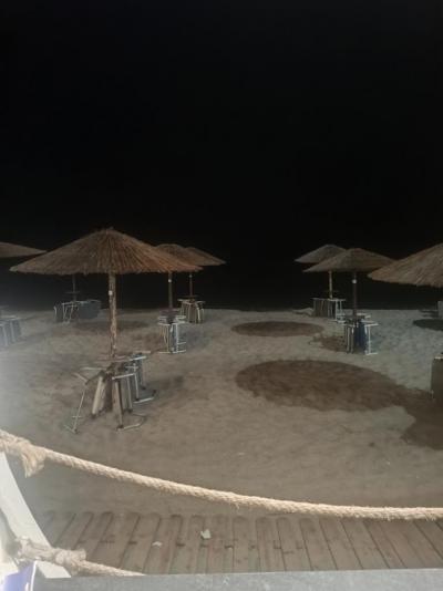 jídelna jak vnitřní, jak i venkovní, s výhledem na moře a na pláž.