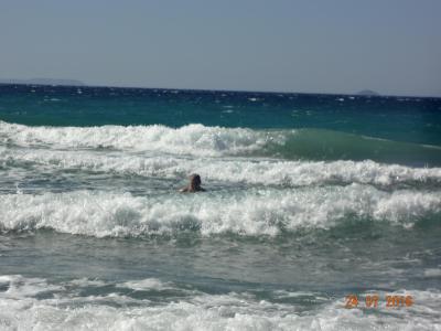 Pláž u moře je travnatá (stříhání a kropení zajišťují zahradníci) a spousta volných lehátek a slunečníků.U moře je pak asi 10 m široký písčitý pás pláže bez lidí.Moře je mělké,ale osobně jsem používal boty do vody (snad už ze zvyku).Čerstvý vítr dělal krásné vlny (více jak 1 metr) tak dlouhodobé plavání dělalo trochu problémy. Klid na pláži a v moři byl fantastický.