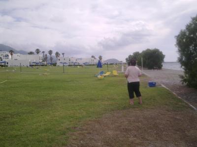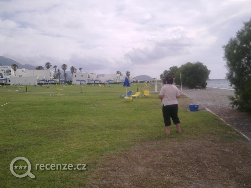 Travnatá pláž až 10m k moři. Vstup do vody pozvolný, snad jen málo lehátek a slunečníků.