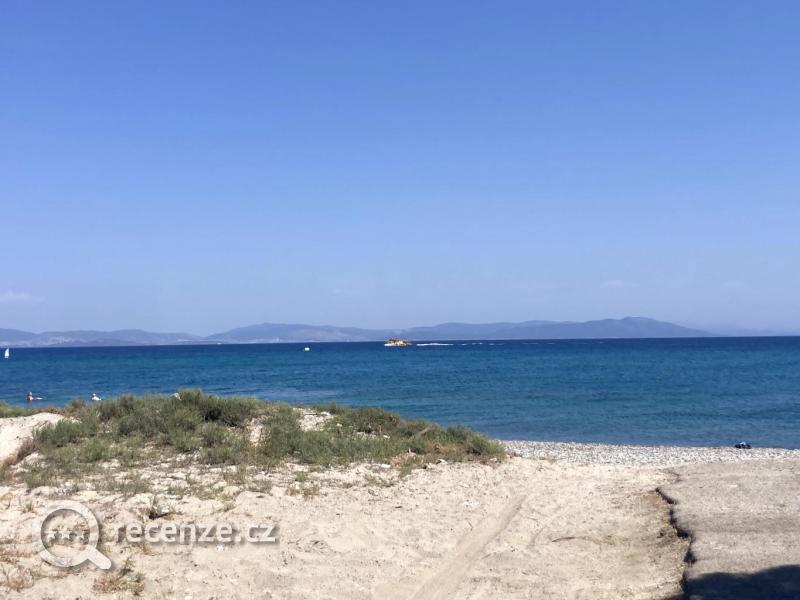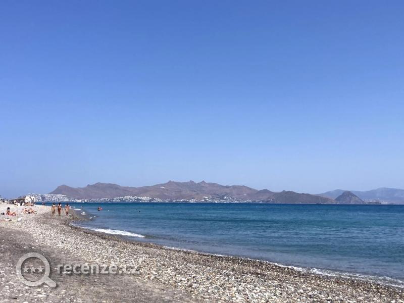 Oblázková pláž cca 300 m. Hotel ale bohužel nemá svou vlastní. Je nutné jít na přírodní veřejnou (bez lehátek) nebo si zaplatit 25 Eur (nikoliv 10,- !) za slunečník a dvě lehátka v Beach baru Milos. Zde se vedle drinků dá i najíst. Kvalita lehce nadprůměrná. Lehátka jsou číslovaná a dají se rezervovat den/dny dopředu. Obsluha na baru příjemná. Brigádníci obsluhující na lehátkách už trochu unavený.:-/. Moře bylo čisté a příjemné na koupání, bez rušivé lodní dopravy.