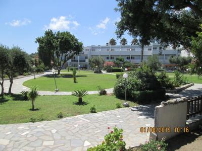 Hotel a bungalovy v krásné zahradě, rozkvetlé keře, kytky, všude palmy. Upravené záhony, čisté WC u bazénu. Po pláži nebo po ulici se dá dojít do města Kos cca dva km, do přístavu tam připlouvají velké trajekty z Turecka. Všude půjčovny kol a skútrů, ve městě jezdí vláček. Taverny, obchůdky.