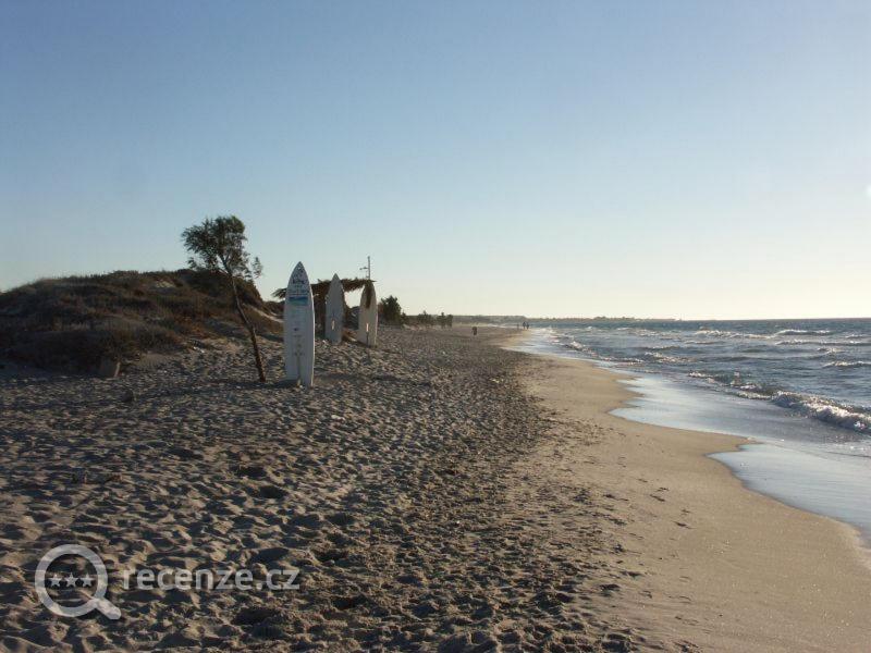 Pláž je kousek 10min.pomalé chůze,lehátka,slunečníky 6eu,nevyužili jsme měli jmse osušky,občas fouká vítr,ale v tom vedru je to příjemné,na pláži půjčují a učí