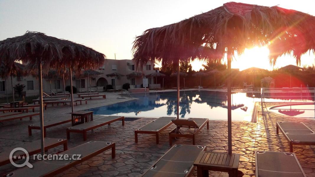Bazén hned u hotelu, pro děti skluzavka, houpačky, domeček. Lehátka u bazénu zdarma, my jsme na hotel přiletěli 30.5., tou dobou bylo obsazeno tak 10 pokojů maximálně, proto nebyl problém najít místo ani u bazénu, ani v jídelně, ke které byla navíc velká terasa, takže se dalo jíst venku nebo uvnitř.