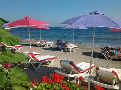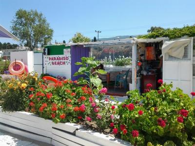 Objevily jsme nedalekou /asi 7 min od hotelu/ soukromou plaz Paradiso Beach jako vystrizenou z muzikaloveho filmu Hair . Za 3,5 eura /os. - lehatko, destnik, v cene denne kavicka a meloun s usmevem mile majitelky v pohadkovem prostredi kyticek! Piscita plaz upravena, sprcha, WC k dispozici, ale boty do vody vzdy!