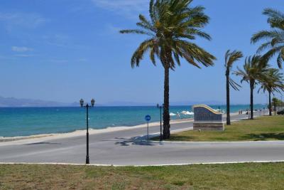 u hotelu je opravdu malá pláž, kde je asi 10 slunečníků(zdarma), chodili jsme asi 15min pěšky do Tigaki kde už to bylo super, za 2 lehátka a slunečník 6euro. Na pláži jsou trochu suché řasy, ale moře krásně čisté :)