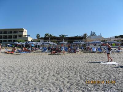 Zpočátku první dva dny byly velké vlny že se do moře nešlo,ale potom již se uklidnilo,voda 28°C.Kousek od pískového kraje jsou větší kameny a je dobré mít boty do vody.Slunečníky a lehátka jsou zdarma a bylo jich dost,hned vedle se provozoval paragleiding,vod.lyže.Na pláž se jde kolem bazenu,ne přes veřejnou komunikaci.