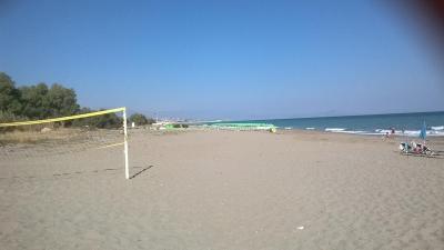 Pláž písečná. V moři podloží - skála, kameny, plavaly v něm trávy, mechy. Teploučké.
