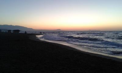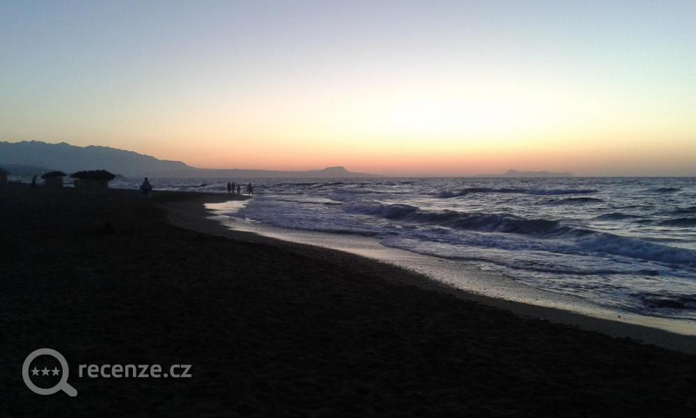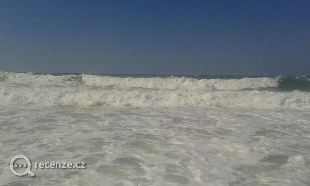 Moře bylo čisté a voda průzračná. S pláží jsme byli spokojeni. Písečná pláž, která se zvolna svažuje do moře, kde jsou v mělké vodě asi 2 úzké skalnaté prahy umožňuje koupání i bez bot do vody. Je tam sprcha pro opláchnutí po koupeli. Na pláži každý den obsluha baru vybírá poplatek 5 Euro za jeden slunečník se dvěma lehátky. Oblast, ve které se hotel nachází, je známá častými vlnami. My jsme měli 4 dny vyvěšenou červenou vlajku na pláži (zákaz koupání), protože byly vlny větší než 1,5m. Kdo si chtěl zaplavat, hned slyšel píšťalku plavčíka, který ho nekompromisně vyhnal z vody. Ty dny jsme chodili do vody po kolena a "dováděli" v přicházejících vlnách - byla to zábava. Místo poskytuje úžasné pohledy na západ slunce a fotografie z večerní pláže se vzdouvajícím se mořem jsou opravdu romantické.