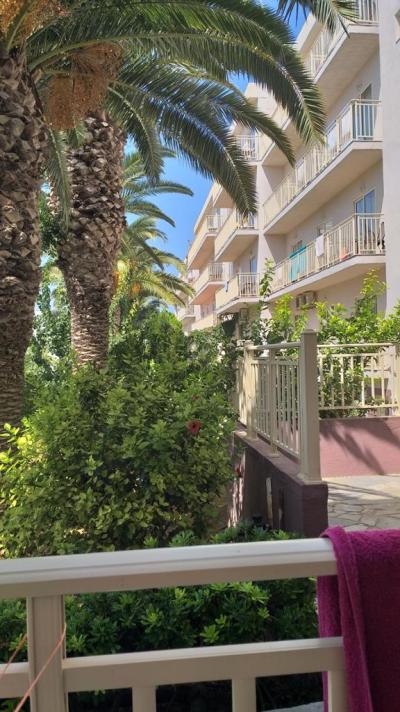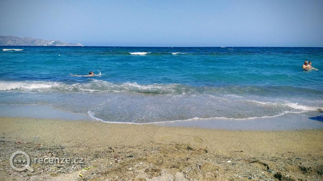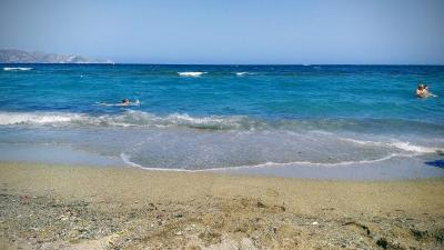 Hotel nemá vlastní pláž.Chodili jsme na pláž vlevo uličkou kousek přes město a pak přes silnici k taverně Lotos.Moře nádherné,vlny každý den a teplý vítr.Také jsme zažili rozbouřené moře,červená vlajka a dost odvážlivců neodradila v koupání.V moři je asi po 30 metrech na dně kamenný vlnolam po celé délce dlouhé pláže a tak se dalo koupání dobře zvládnout i ve vlnách.Boty do vody není třeba.
