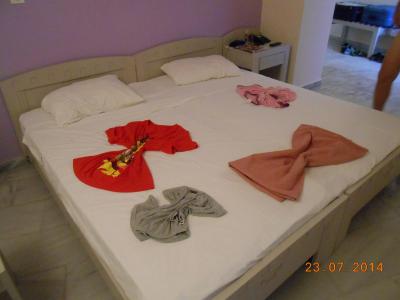 Nebojte se prvního dojmu při cestě z recepce po schodech dolů. Není to cesta do sklepa, ale do přízemí. Terasy jsou dle nás možná lepší než balkóny, i když nemají výhled na moře, ale na krásné oleandry a muškáty. Bydleli jsme v odlehlejším křídle hotelu, kde byl klid na spaní,