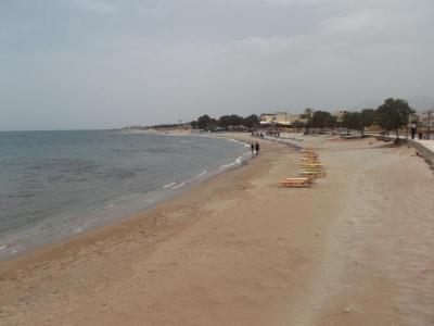 Pláž je od hotela oddelená cestnou komunikáciou, ktorá nie je veľmi frekventovaná. Ale je to veľmi pekná a piesková pláž. Snečníky a lehátka sú k dispozícií za poplatok.
