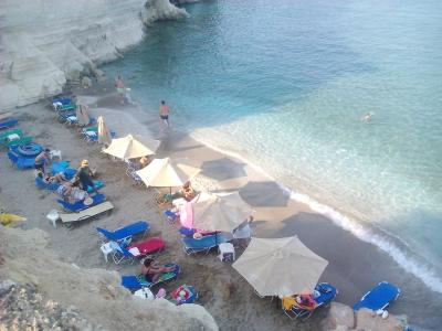 Skvělé!!! Pláž pod Malievi písčitá, dno moře větší kameny, pláž napravo od Mylosu je nádherná, je ukryta v takové skalní podkově, schází se po vytesaných schodech do skály, nefouká zde vítr, nejsou vlny a naprosto křišťálová a teplá voda - super šnorchlování, dno moře jemný písek, zastavují zde výletní lodě, aby se turisté pokochali tou krásou a vykoupali, což ale není žádnou překážkou. Obě pláže 10 - 15 min chůze od Mylosu, z kopce a pak do kopce, ale pěkná procházka.