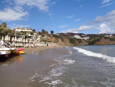 Zátoky s malými písčitými plážemi, vlny jsou tu málokdy. 5 - 10 metrů je mělko, jemný písek i na dně, boty netřeba. Přístup k plážím náročnější (např.pro kočárek s dítětem) - z prudšího kopce nebo po schodech. Malá pláž Varkotopos - od hotelu celkem asi 250 metrů dolů. Zde slunečník a 2 lehátka 20 euro za den (v říjnu). Na konci pláže je menší volný prostor na deky nebo hraní. Na vedlejší pláži Livadi za slunečník s lehátky 15 euro. Od hotelu opět nejdřív z kopečka, kousek po silnici a dolů po schodech. K dalším plážičkám v blízkosti jezdí každou hodinu silniční vláček (celodenní jízdenka 5 E). Pláže uklizené, teplota moře v říjnu cca 23 stupňů.