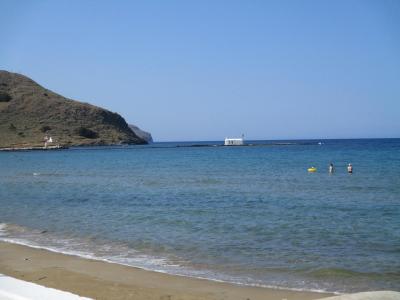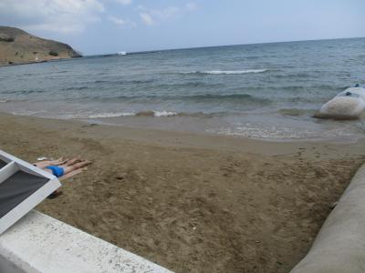 Kvůli moři jsme tam jeli a to nás nezklamalo. Bylo čisťoučké, pláž skutečně písečná a v moři také skutečně písek (byly malé úseky, kde se nacházelo trochu oblázků). Pláž sice úzká, ale jelikož tam bylo opravdu málo lidí, tak jsme se vešli. Vzdálenost od hotelu přes silnici. Od čtvrtka tam také již byly slunečníky a lehátka (18 lehátek na celý hotel). Kdo nemá rád vlny, ať do Georgioupoli nejezdí. Pěkně nás to "vlnilo".