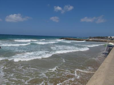 Pláž patřící hotelu je úzká a opravdu je většinou zalitá mořem, které někdy odnáší i lehátka a stolky. Moře krásné a čisté, vstup do vody bezproblémový, všude písek. Většinu času byl vítr a velké vlny, proto ve vodě moc lidí nebylo.