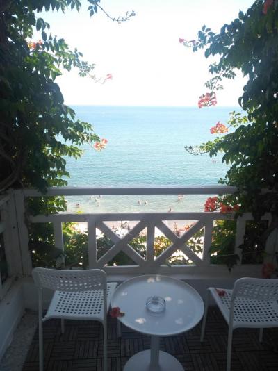 Pláž: pláž hned u hotelu, kamínkovitá. Platba od 5€ do 10€ za dvě lehátka a jeden slunečník. Musím říci, že mi nebylo líto za to ty peníze dát. „Beachboy“ velice ochotný, přinesl stoleček, popelník, kyblíček s vodou na opláchnutí nohou, aby jste si na lehátko nenaházeli z nohou kamínky. Kdykoliv viděl, že potřebujete sklopit nebo jakkoliv otočit deštník hned přišel a pomohl s tím. Nemůžeme si stěžovat. Boty do vody jsem si s sebou brala, nicméně zbytečně. Nechte je doma, sestup mírný, nejdříve kamínky poté větší ploché kameny, které však neklouzaly a pak už jen písek. Moře nádherné, čisté.