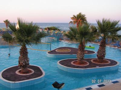 Lehátka a slunečníky jak u bazénu, tak u pláže zdarma. Je tam posilovna, masáže, volejbal - nic z toho jsme nevyužily. U venkovního baru dávali po celý den cca do 22h. pivo, víno, ouzo, colu, fantu, sprite... Personál moc usměvavý nebyl, asi toho měli za celý den dost - makali jak šrouby :-).