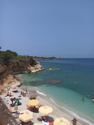 Malá pláž je 500m od hotelu, lehátka a slunečníky za 10eur. Drobné kamínky. Super. Ve městě pláž se slunečníky a lehátky za 12eur, špatný vstup do moře (velké kameny). Hotel nemá svou pláž.