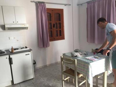 Ubytovali nás v apartmánu Eleni, který byl nejdál (cca 350m), mimo areál Kalia Beach a totálně odporný. Špinavý, ze země vedly kabely, s kuchyňským koutem, ikdyž jsme měli all inclusive. Po okamžitém telefonátu delegátce nám s recepčním navrhli odvoz na 1 noc do jiného hotelu od stejného majitele a zbytek pobytu strávit v hlavní budově Kalia Beach v pokoji superior, který je normálně za příplatek 15euro/noc, ale pro nás zdarma.