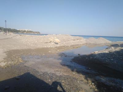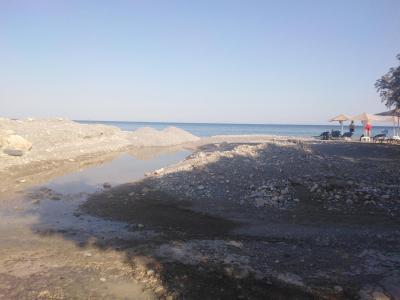 Pláž je hned před hotelem, lehátka, sprcha. Než vlezete do moře, musíte přejít muldu kamínků, vstup do moře je nepříjemný, malinké kamínky, větší kamínky, balvany, musíte plavat asi 5 metrů od břehu, než je písek. Hned vedle pláže je jakási podivná stoka, která ústí do moře (nějaký potok).