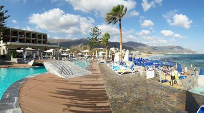 Pláž písečná čistá, měnší příjemná, ale hned velde z obou stran jsou velké pláže. Pláž byla každý den pečlivě čištěna. Na pláži dostatek lehátek se sluněčníky. Moře čisté. Každý kdo jede na sever kréty, musí počítat větrným počasím a většími vlnami.