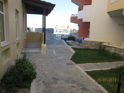 Na pláži před hotelem je možné si pronajmout deštník a lehátka. Nevyužívali jsme. Chodili jsme asi o 50 metrů dál, kde si děti mohly stavět hrady z písku a nikomu nepřekážely. Vstup do moře: profil dna se během pobytu a působením neustávajících vln stále mění. První dny u břehu asi šestimetrový pás valounů 3 až 15cm klesá do hloubky 160 cm (velice nepříjemné). Po osmi metrech asi třicetimetrová mělčina, hloubka kolem 1 m. Dva dny pro velké vlny zákaz koupání. Profil dna se změnil. Místo valounů hrubý písek po kotníky. Na mělčině hloubka asi 70 cm. Nejvhodnější místo pro vstup do moře je na úrovni plavčíkovy věže. Na jiných místech silný unášivý proud podél pobřeží.